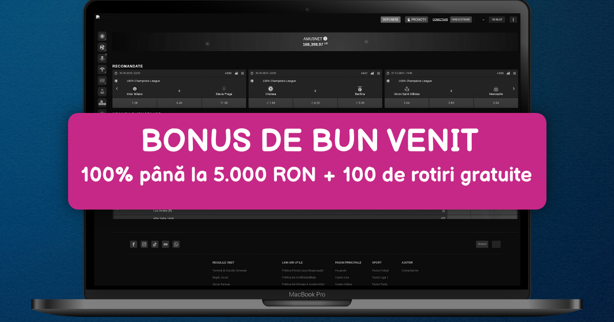 Bonusul de bun venit la Vbet Casino oferă 100% până la 2.000 RON plus 100 rotiri gratuite, fiind una dintre cele mai generoase oferte din piața românească. Această promoție dublează efectiv primul depozit al jucătorilor noi, oferindu-le mai multe șanse de a explora jocurile.